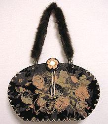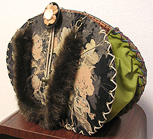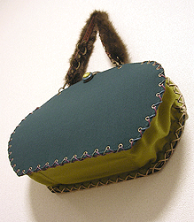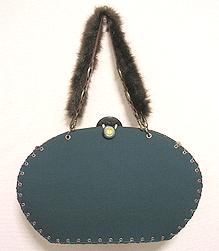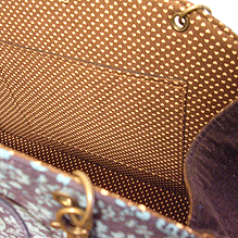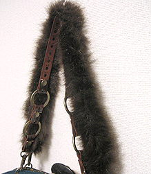 ◆本体の形:大福 ◆マチ:Mサイズ・幅10cm ◆組立コード:ベージュ/グラデーション紫系 ◆組み方:クロス ◆ハンドル:フェイクファーBR/スペイン製PUレザー/BR/45cm