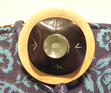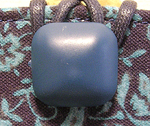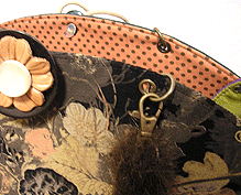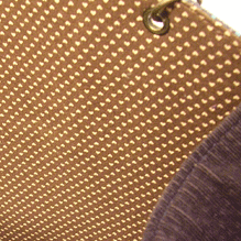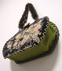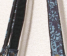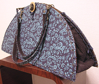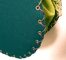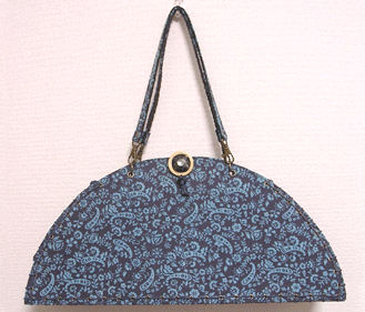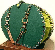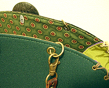 この第一作目はサンプルを参考にご自身で生地等をご選択。ご選択部分はというと…本体外側(グリーンの面)とコードの色&綴じ、グリーンの向こうに見える内側の生地(グリーンの柄物)、グリーン面のボタン及びハンドル。