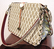 ◆本体の形:台形 ◆マチ:Sサイズ・幅12cm ◆組立コード:グラデーション茶系 ◆組み方:クロス/和綴じ ◆ハンドル:ジャカード織(本体外側と同じ)×帆布エンジ(本体内側と同じ)/2×45cm2本