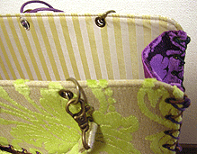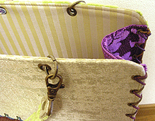 TT様には、サンプルのピアニカをお気に入りいただき、ほぼサンプル通りにマチ外側の生地、ゴールド側のボタン、ハンドルをチェンジ。和装にお持ちになりたいそうで、ハンドルは短い方の定番サイズをご希望になりました。なかなかにゴージャス・キュートなバッグに仕上がりました!