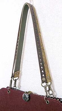 ◆本体の形:A4タテ ◆マチ:Lサイズ・幅8cm ◆組立コード:グラデーション茶系/グラデーション紫系 ◆組み方:和綴じ ◆ハンドル:スペインレザー/50cm/こげ茶/本革型押し×カーキ/50cm ◆ボタン:メタル調ボタン×ヴィンテージ
