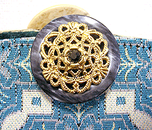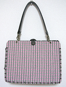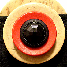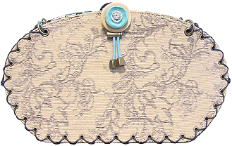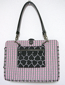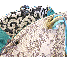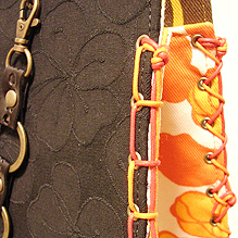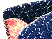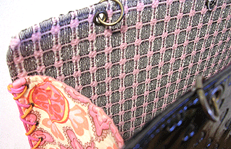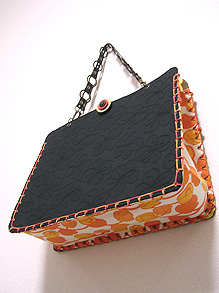 モアレの地模様があるもののほとんど無地に近かったマチを反転させて柄を外に出しました。加えてピンク×グレーのツイード面を内側にしてハートのレースを外側に。オレンジ×チェリーピンクのコードで再立体化。ボタンはどちらの面もそのままですが全体的に華やかイメージになりました。