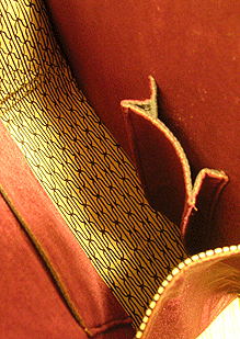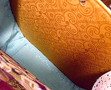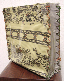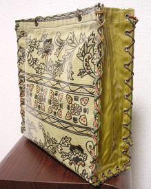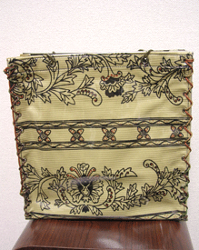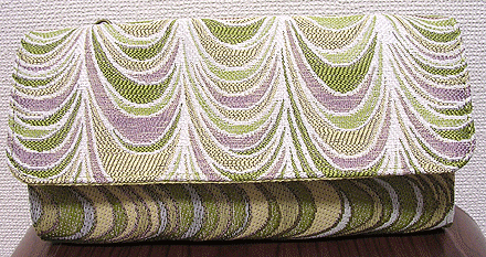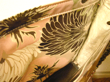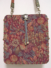 第四作目の春仕様の際の生地と同じトルコのゴブランで。カバー部分は生地のオモテ面で、本体部分は同じ生地のウラ面を使用。柄の向きも変えてなかなかに凝ってます!