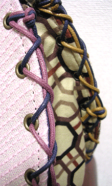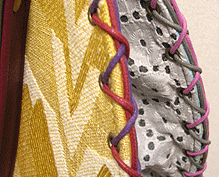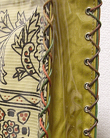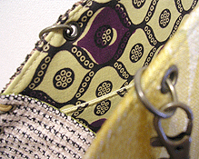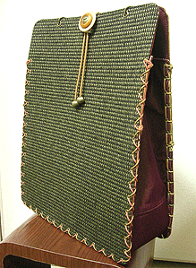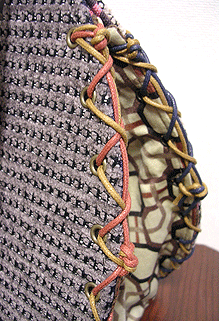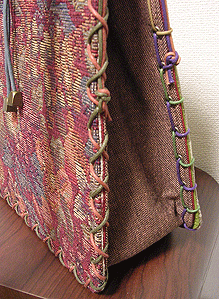 マチのグレーは写真ではわかりませんが、蛍光パープルとライムグリーンの玉虫という凝った生地。組み立てコードのグラデーションがマスタードのマチにもグレーのマチにもよく合ってます。