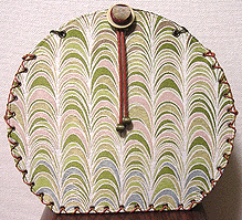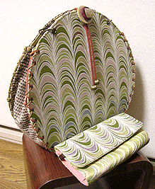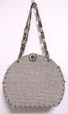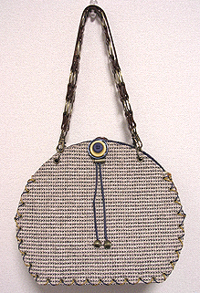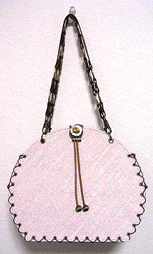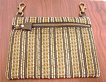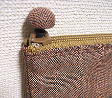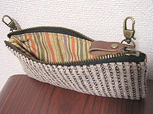 第三作目のオーダー時、マチの外側と同じ生地でポーチもオーダーされ、インポートのリボンを貼ってポイントにしました。ファスナーのスライダー部分はもちろん「くるみボタン」仕上げ。スライダー部分にくるみボタンを使うのは DESIGN OF ALL オリジナルです♪