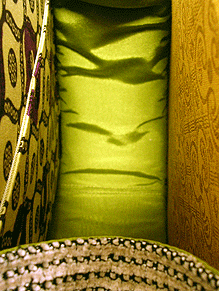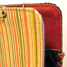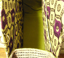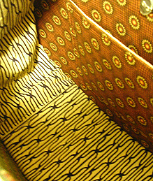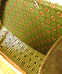 新調したブラウン面の内側は、前回と同じアフリカンバティック。既存面(黄色い面)の向こうに見える景色がお気に入りだそう。でもせっかくなので柄の向きを変えました。ポケットも前回と同じく横長タイプで真ん中に仕切りのあるものを採用。