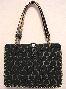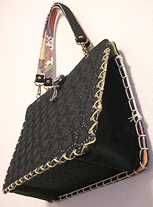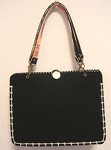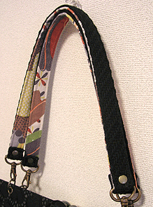 ◆本体の形:A4ヨコ ◆マチ:Mサイズ・幅12cm ◆組立コード:イエロー×グレー/白 ◆組み方:クロス/和綴じ ◆ハンドル:本体と同じ生地の黒×本体の内側と同じ花柄/2×45cm2本