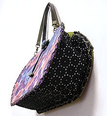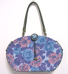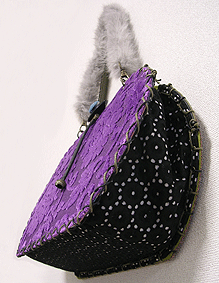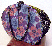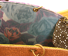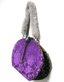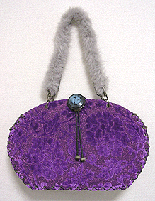◆第一作目のブルーの花柄面のコードをほどいて解体、内側を外側に組み替え ◆グレーのファーのハンドルを追加 ◆ボタンと組み立てコードはそのまま使用 |