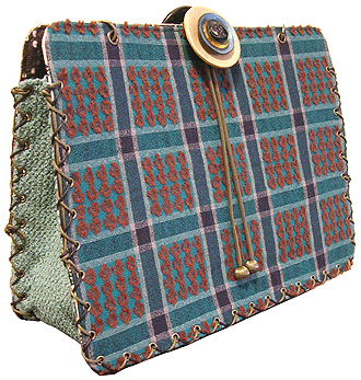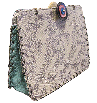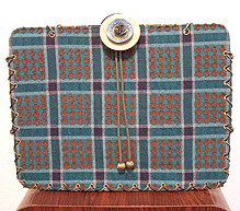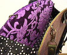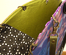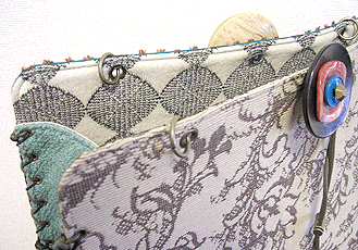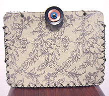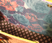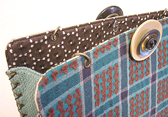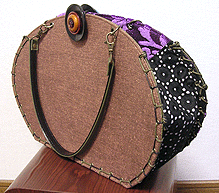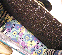 | 第二作目もキュートで個性的な逸品になりました。やはり直感でピックアップした生地たちを並べて更に念入りに吟味し取捨選択、というYKI様らしい選び方で。ボタンも前作同様チェック面は三重、ベージュ面は四重と、色合わせもさすがです。内側のレースは、第一作目のマチ外側に使用されたレースの焦げ茶バージョン。このレース、YKI様によくお似合いなのです。どの生地をどの面に使用するか (マチにするのか本体にするのか、内側にするのか外側にするのか、など)、少し悩まれましたが、最終的にBEST FIT!すべてまる〜くおさまりました♪ |