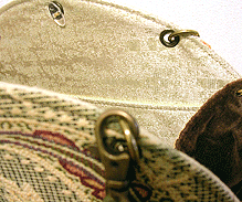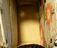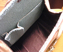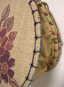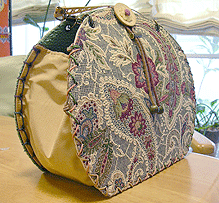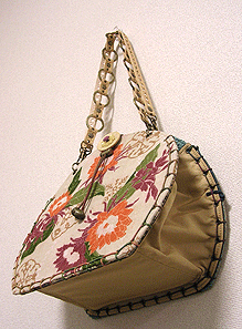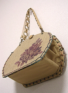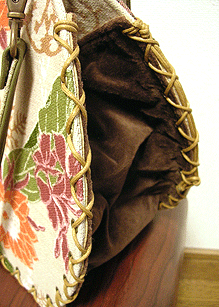 第一作目のドンゴロス面が傷んできたということで、大のお気に入り・アジアなお花柄プリント×伊製ゴールドで本体1面新調。ゴブラン面のコードも擦り切れてきてたのでお取り替え。全てのコードを外してバラバラにするので、マチも裏返してこげ茶の別珍を外側にしました。