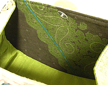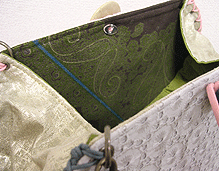 内側の生地は大判のパネルプリントのおもしろいコーデュロイ。どの部分を出すかで表情が全く変わるという遊び心満載な生地。この面を外側にしてもKO様お似合いになるだろうなぁ。そのうち♪