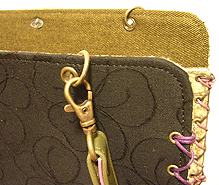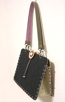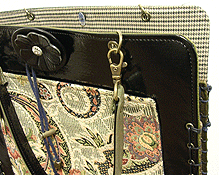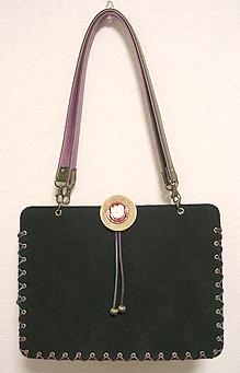 なので新しく選んでいただいた生地は、本体外側のお花の刺繍が施された黒い生地、マチ外側のイタリー製ゴールドと内側のスモーキーピンクのデニム。