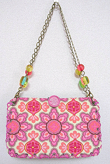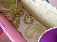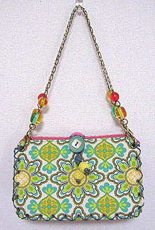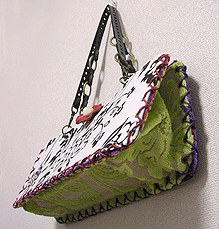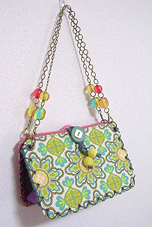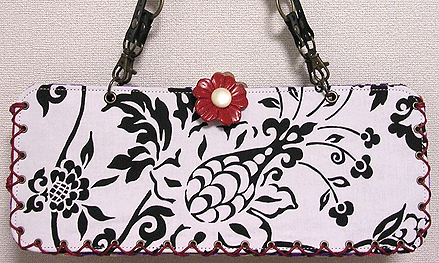 こちらは第五作目のMM様のバッグ。Sサイズの最新型「ピアニカ」です!「以前から気になっていた」という紫の花柄ラメラメ生地及びその色違いの赤はゼヒモノとして、新入荷のグリーンの生地とフランス製モノトーンプリントも外せぬアイテムとなり、どこにどれ使うねん?!という試行錯誤を繰り返し、繰り返し…。結局やはり気になってたという黒いレースも加えてうまい具合に収まりました。はぁよかった。てかめちゃくちゃかわいくってオサレでほんに素敵なバッグになりました♪