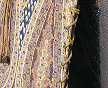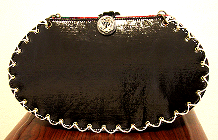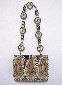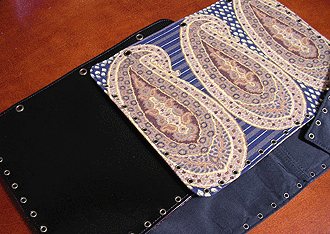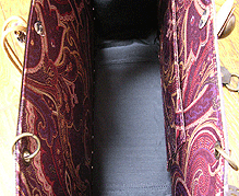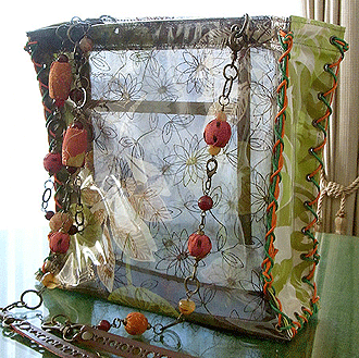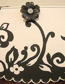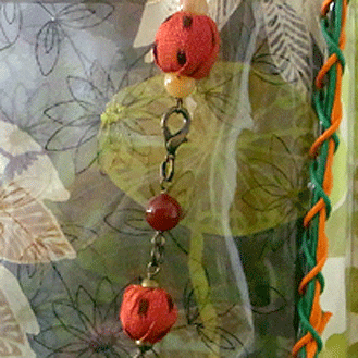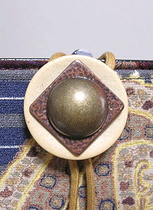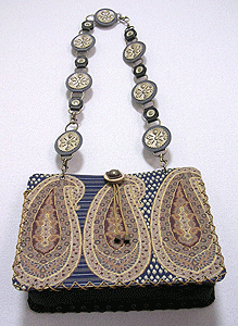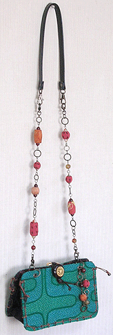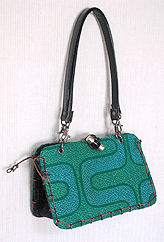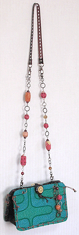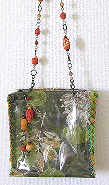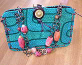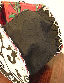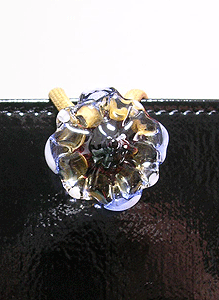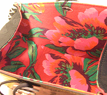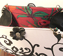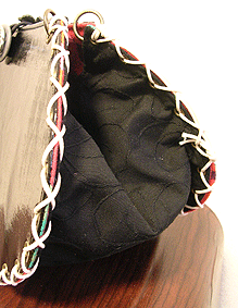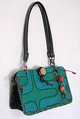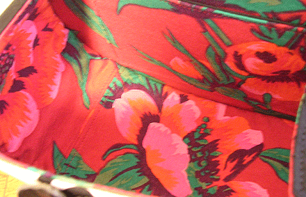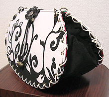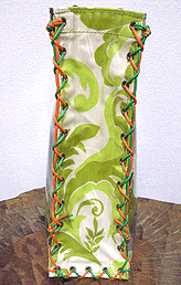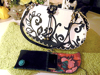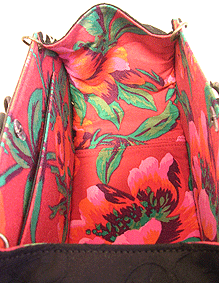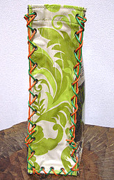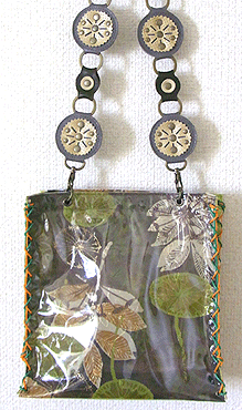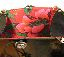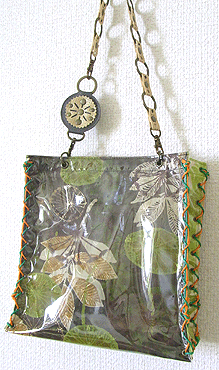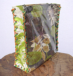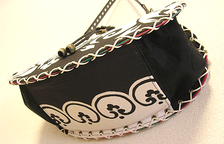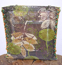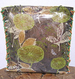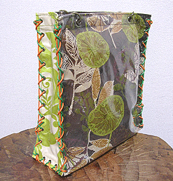 本体の生地は薄いオーガンジーのような風合いで、葉っぱのプリントの上にさらに刺繍でお花や蓮の葉のようなモチーフがほどこされています。ところどころ金色も入っていて、一見地味に見えますがなかなかにゴージャス☆組み立てコードには、敢えてビビッドカラーをチョイスされ、夏らしく明るい印象に仕上がりました♪ NF様ご自身が激写してくださったお写真♪お手持ちのハンドルを取っ替え引っ替え取り付けて撮影してくださって、バッグへの愛情を感じます。ありがとうございました・涙。