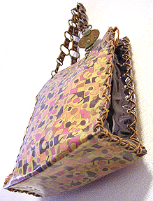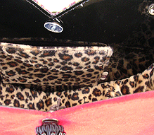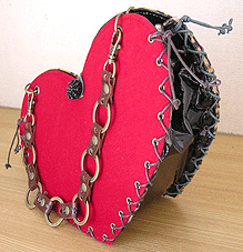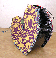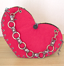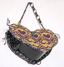 本体外側の片面は真っ赤なベッチンで可憐に。もう片面はマスタード×パープルのハート柄!内側は両面とも黒のエナメルですが、ヒョウのポケット☆マチもエナメルを表にして組んでいますが内側はヒョウ!ほどいて引っくり返すと、黒のエナメル×ヒョウというワイルドなハートに大変身しちゃうんです♪しかもハンドルはチェーン!つなげて腰の位置にするとウエストバッグにもなるという玄人はだしな一品になりました◎