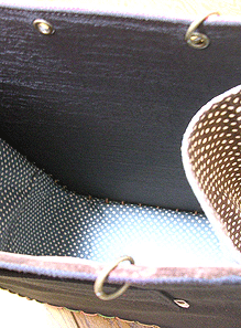 ただ、右上写真でちらりと見えてる本体内側のピンク×オレンジのドットをお見せできないのが残念。この部分をお見せできれば更に外と内との対比を楽しんでいただけるのですが。