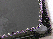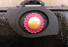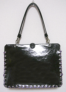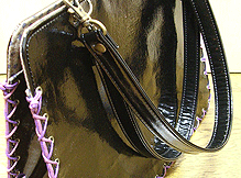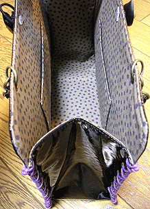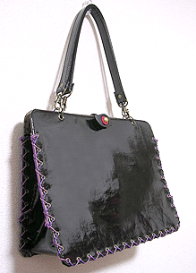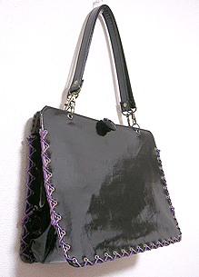◆本体の形:A4ヨコ ◆マチ:Mサイズ・幅10cm ◆組立コード:パープル×スモーキーピンク(両面共) ◆組み方:クロス ◆ハンドル:エナメル×エナメル/2.0×45cm×2 ◆ボタン:木×ローズピンクのお花×くすんだ枇杷色ヴィンテージボタン+カットワーク(黒)
