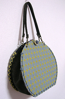 ◆本体の形:どら ◆マチ:Mサイズ・幅12cm ◆組立コード:イエロー/スモーキーブルー ◆組み方:クロス/和綴じ ◆ハンドル:マチの外側の生地×本体内側ネイビーの生地/1.5×45cm×2