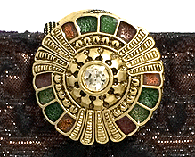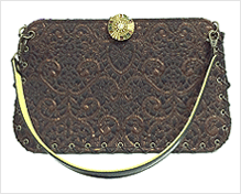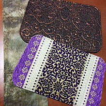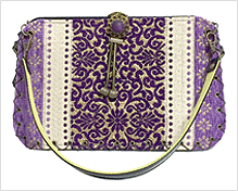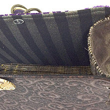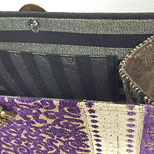 華やかなパープルのモロッコのゴブラン織をメイン面にして、反対面はイタリー製のシックなブロンズのアラベスク模様。仲を取り持つのはやはりイタリー製の迷彩柄。ハンドル内側のライムグリーンを挿し色に、エレガントで上品なバッグが誕生しました。