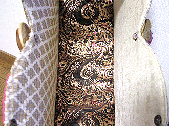 完成したバッグを見て「マリー・アントワネットみたい」と思ったのでMT様にお伝えすると、なんと本当にマリー・アントワネットが大好きだったそう!ピンク×ゴールドの生地はモロッコのゴブラン織。角度によってと〜っても派手に見えますが、実際にはそうでもなく意外ともちやすいんです。シンプルでシックな色合いにも派手目の色合いにも合うので、お洋服選びは結構楽かも。もちろんジーンズにもワンピースにも。